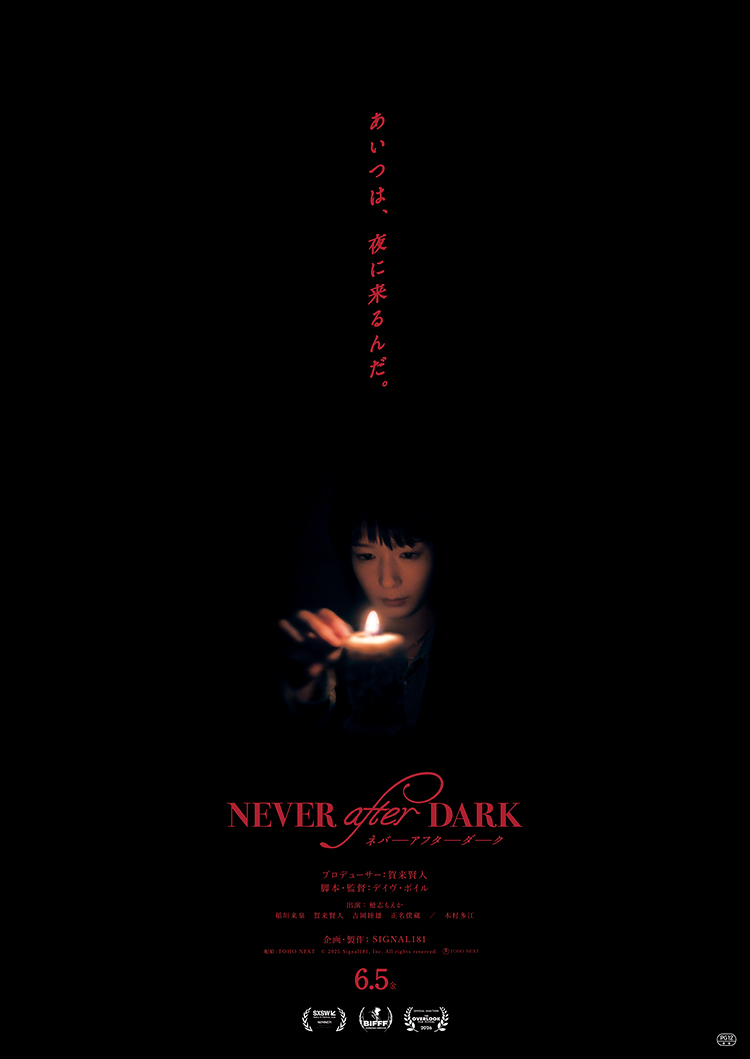 6月5日(金)に公開を迎える映画『Never After Dark/ネバーアフターダーク』は、米国最大級のカルチャーの祭典「第33回サウス・バイ・サウスウエスト(SXSW)2026」でミッドナイター部門へ正式出品され、見事「観客賞」を受賞。さらに、ベルギーで開催された「第44回ブリュッセル・ファンタスティック国際映画祭」コンペティション部門や、ニューオリンズで開催された「第10回オーバールック映画祭」コンペティション部門にも出品されるなど、現在、世界中から注目を集めています。本作は、俳優・賀来賢人がプロデューサーを務め、Netflixシリーズ「忍びの家 House of Ninjas」(24)でタッグを組んだデイヴ・ボイル監督と共に立ち上げた映像製作会社「SIGNAL181」による初の劇場作品です。従来のジャパニーズホラーの枠に捉われない世界基準の映像美を追求し、アメリカから撮影監督を招くなど、細部にまでこだわり抜かれた本作の制作秘話にも迫ります。